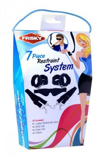We are going to play a little game. First we are going to put this blindfold on so you can wait in true anticipation of what is next. Then feel your arms pulled tight behind your back. No, no, you are not going anywhere. Next, you are going to lie back and… Frisky at your service with the Sado 7 Piece Restraint System. How loevely it is to see your captive writhe in anticipation as they are blindfolded and restrained. Each cuff is made of heavy-duty neoprene with nylon added for extra support, and secured by a velcro closure for quick and easy release.