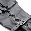 Measurements 22 inches in total length. Shoulder straps adjust from 6 inches to 11 inches in circumference. Arm sleeve length is 18 inches. Materials polyurethane PU leather, metal, nylon. Color Black. Note locks not included.