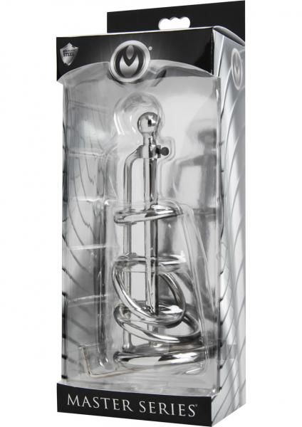 This adjustable sounding cage will hold your cock upright as the hollow urethral insert slides deep inside. The floating sound is capped with a ball, and features a hollow core for liquid to pass through. Each ring is hinged for a better fit, and an Allen wrench is included so that you can clamp the insert in place once you have reached your desired depth.