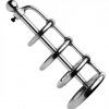 Measurements: Cage: 6 inches in total length, rings measure 1.25 inches, 1.65 inches, and 1.85 inches in diameter. Sound 5.5 inches in total length, 4.6 inches insertable, 0.3 inch in diameter. Material Stainless steel. Color Silver.