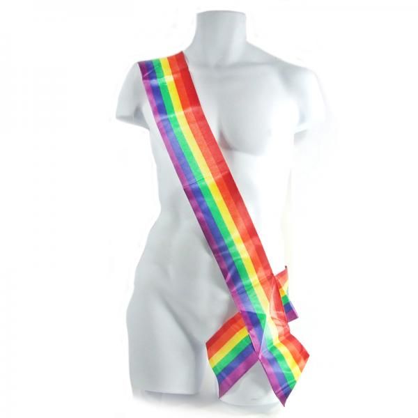 Gaysentials Pride Goods Party wear Rainbow Sash. Wear the Gaysentials Rainbow Satin Sash radiant rainbow satin sash during pride to announce your royalty. Great for pageants and party guests. Perfect for Bachelor and Bachelorette guest of honor. This sash measures 33 inches long by 4 inches wide.