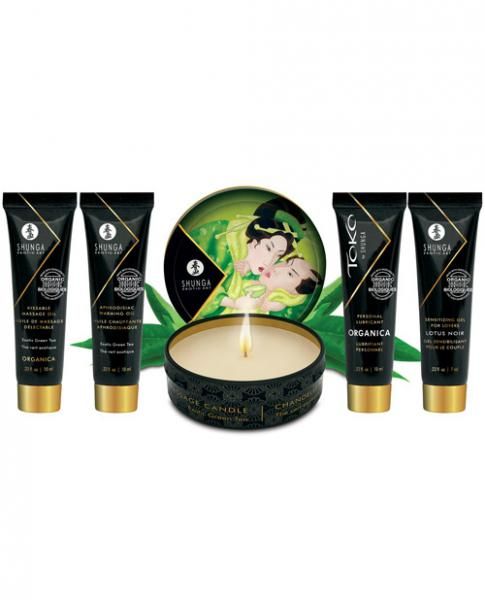 Geisha’s Secret Kit Organica Exotic Green Tea includes 5 products: Organica Kissable massage oil .33 fluid ounce, Warming aphrodisiac oil .33 fluid ounce, Zenitude Mini Massage Candle 1 ounce, Toko Organica Personal Lubricant .33 fluid ounce, Lotus Noir sensitizing gel for lovers .23 fluid ounce.