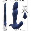 Gender X True Blue Vibrator for stimulating prostate from Evolved Novelties. This ultra smooth Silicone adult toy thrusts and vibrates with two 10 speed motors that work together for a truly extraordinary experience. A textured, thrusting long shaft tapers to a rounded gently sloped head while the handle features a vibrating mini thrust tip on one end and a saucy flipper on the other. The satisfying T shape fits beautifully in the hand with curves and planes offering delicious possibilities. All controlled by one simple button. Water submersible for bath or shower time, rechargeable. Easy to clean. Features: thrusting, vibrating T-shape. 10 vibrating, thrusting speeds and functions. Motors work together. Textured, thrusting shaft, .25 inch thrust distance. T-shape for easy control and navigation. Easy to use. 1 button control panel. Blue Light Emitting Diode LED illuminates button when in use. Made from ultra smooth Silicone. Detail made from rose gold finished ABS Plastic. Size height 5.34 inches, depth 4.18 inches width 1.52 inches. Insertable length 4.16 inches, insertable diameter 1.25 inches. Bulk weight 4.2 ounces. Phthalate free and latex free. Waterproof vibrations and submersible for bath tub play. Rechargeable, USB cable included. Categories: Prostate Massagers, P-Spot Stimulators, Prostate Massagers, Rechargeable Vibrators, Male P-Spot Stimulators. 2022.