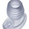 Glowhole 2 Butt Plug with LED Insert Large Clear Frost from Oxballs. LED lit for a better view, multicolor strobing effect. Ergo shape with wide base. Perfect Thermoplastic Rubber TPR silicone blend firm enough to stay open. Like our Pighole design with larger opening and bigger base. Smooth slick finish Plus Silicone feels velvety and plush. Glowhole is Oxballs slick new fuckplug (our name for plugs that make it possible to insert toys, fingers, vibes and penetrate), its ergo shape fits just right and the wide funnel base is shaped to keep you open just like our platinum silicone Pighole toys but in our Plus Silicone translucent clear TPR/Silicone blend.But this toy it lit up! A tiny LED bullet insert at the base safely lights up the core of this pluglighting up the hole it plugs outside and in. A plug with a view. Comes in 2 sizes, the smaller one is a good starter size, the large one if for holes that like bigger toys.