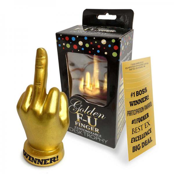 Recognize the olympic level fucker in your home, school, office or team with the FU Finger Trophy. This 6 inch trophy is fully customizable for that unique fuckwad. Choose from our favorite accomplishments such as #1Boss, Winner, Participation Award, #1 Fucker, Best Ex, Excellence and Big Deal, or create your own.andnbsp; Never let another fucker in your life go unrecognized!