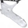 This clear penis extender adds length, girth, and hardness while allowing your rod to show through. The elastic waist and ergonomic base hold it tight to your body as the realistic head and textured shaft penetrates your partner. Can be used hard or soft, with a hole at the base that allows your balls to hang down. A single strap runs up the back, and the sturdy elastic stretches to fit most any size.