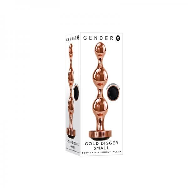 Gold Digger Small Small, sleek andamp; stylish everything you want in a body-safe metal plug that features a sparkling black gem at the base! Savor the bulbous, nonporous, shiny shaft that with incremental bulbs that look shapely and feel even better. Discover how this shapely metal sculpted plug can enhance your erotic play time and try sensation play by warming or cooling your plug first with water. Small rose gold beaded metal plug Incremental 3-bead design Cool or warm with water for sensation play Stylish sparkling black gem base Made from body-safe nonporous aluminum alloy Gem made from durable ABS plastic Wide safety base Waterproof Phthalate andamp; latex free Length: 4.14, Depth: 1.25, Width: 1.25 Insertable: 3.75, .9 diameter Weight: Under .5 lb