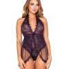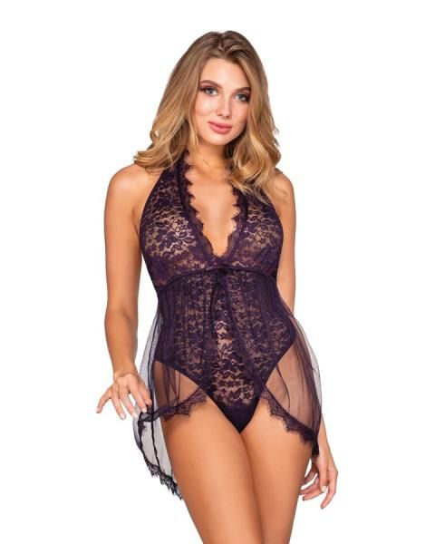 Halter Plunge Front Stretch Lace Teddy Eggplant O/s