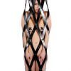 This incredible bondage device is made of sturdy leather straps, designed to enfold, enclose, and ensnare your subject. The solid platform base allows your partner to stand inside. As they step on the leather wrapped wooden platform, the weight pulls the crisscrossed leather straps downward, trapping your subject inside. The mechanism is similar to how a Chinese finger trap works. Once inside, your partner is caught and at your mercy. The leather straps will twist around your lover, cradling their body as they spiral upwards, coming together at the top where the straps attach to a sturdy leather-wrapped metal ring. Measurements: Cage measures 75 inches in total length, base and top ring measure 12 inches in diameter. Material: Leather, metal, wood. Color: Black. Note: Please follow proper installation procedures and consider the weight-bearing capability of your installation spot. We would advise installing this item in a beam. These products as with all products on this site are supplied AS IS. No warranty is given either implied or expressed. Products are intended as novelty only, and no representation is made or implied as to their suitability or safety for any particular use. Purchasers use the products entirely at their own risk. The manufacturer or re-seller is not liable for any direct, indirect, incidental or consequential damage or loss howsoever arising caused by use or misuse of the products. This includes, but is not limited to, damage to the products and personal injury or damages due to use or misuse. Warning: This is a NEW item that is not in retail packaging, usually a plain box, wrapped in plastic or a poly bag. 200 Lbs weight limit.