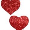 Sweet Red Glitter Heart Pastease made of durable, no-mess, glitter pleather materials that form to curves and resist wrinkling over hardening nipples. Made in the USA with soft yet durable Eco-friendly materials that form to curves with only the finest medical grade, waterproof adhesive. All Pastease are hand made using over 80% post consumer recycled materials. Sweet, flashy fun! Dimensions: 3 inches wide by 2.5 inches tall. Coverage Diameter: 1.8 inches.