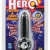 Hero Cock Ring and Clitoral Massager is available in two colors: Clear and Black. Each sold separately. Unique bullet sleeve clitoral stimulator. Cock Ring features 10 different functions. New sex toy simultaneously stimulates clitoral and testicle areas. Hero Ring helps keeps you harder longer while the clitoris pleasing nubs stimulates your partner. Super stretchy ring. Easy to operate on/off button. Removable bullet. Waterproof vibrations for play outside the bedroom. Safe for most skin types. Made using phthalates free, RoHS compliant materials: cock ring SEBS, ABS plastic bullet. Vibrating cock requires 3 LR44 (AG13) batteries, included. bullet measures 3 inches long. Cock rings when worn around the base of the penis and testicles, many users find that cock rings increase sexual pleasure. Prolong rings, erection enhancement, climax control rings, cock rings. A water based lubricant is recommended. Always clean before and after use. Hero Cock Ring and Clitoral Massager from Nasstoys of New York.