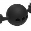 Measurements adjustable between 16 inches and 24 inches in circumference, ball measures 1.6 inches in diameter. Materials Silicone, metal, vinyl. Color Black.