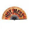 Hot Mess Hand Fan from Wood Rocket. The fans are folding fans, so the close as well as open. Plus can be used to fan. Fan measures approximately 13 inches in height by 24.5 inches in length by 0.75 inch in width open and 13 inches in height by 1.5 inches in length by 0.75 inch in width closed, folded. Fans are made of Bamboo Ribs and a Satin Fabric material for the fan. Bulk weight approximately 0.5 ounce. Fan looks like a half of a pepperroni pizza. Categories: Party Games, Gifts, Supplies, Adult Gags, Gifts and Novelties. 2023.