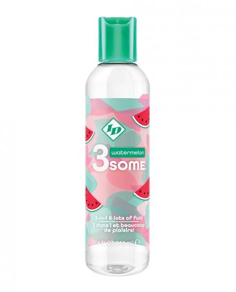 ID 3Some Watermelon 4 ounces from ID Lubes. Lick. Massage. Warm. 3 in 1 and lots of fun! Delicious flavor. So delicious that you can not help but lick! Available in 4 mouth watering sugar free fruit flavors that taste just like the real thing. Pure, no extra additives. Two simple ingredients and nothing more. No water added! 3 In 1 Multi-use. Great for oral pleasure and sensual massages. Gently caress to feel a delightful warming sensation. Non-Staining, easy to clean. Rinses off easily with just water, perfect for easy use and clean up. Sex Toy friendly and latex condom compatible. Safe to use on silicone and rubber toys. Compatible with natural rubber latex. Ingredients: Glycerin, Natural Flavor.