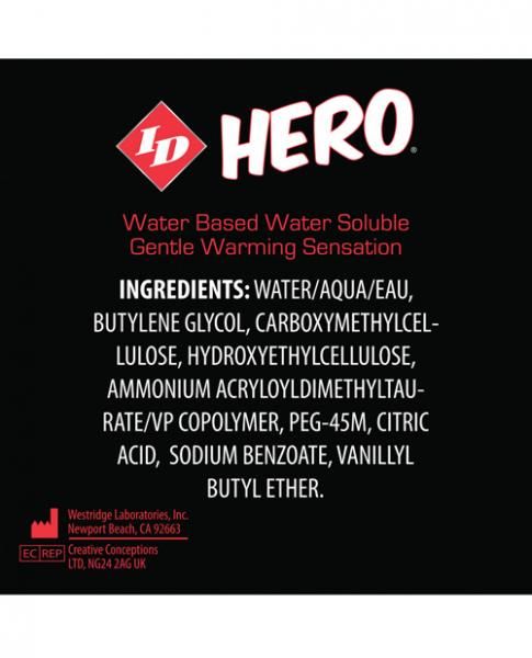 ID Hero Heat Ray Personal Lubricant 4.ounces plastic bottle. Heroic warmth. Water Based Warming Formula Glycerin and Paraben Free! Turn up the heat with glycerin and paraben free Hero Heat Ray. Hero Heat Ray gets along well with others and plays nicely with others, especially with Cool Blast. Water-based Heat Ray ignites your escapades for a POW! ZING! experience.