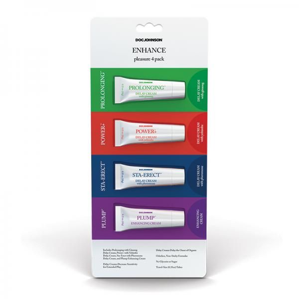 Keep the good times going with this pack of creams designed to keep you harder for longer. Included are four options. Plump is an enhancing gel that helps increase blood flow to the penis, which makes for a thicker, larger look and feel. Sta-Erect is a delay cream formulated with pheromone to boost sexual desire. Power+ delay cream is formulated with yohimbe, which provides increased circulation and blood flow. The Prolonging delay cream includes ginseng, a traditional aphrodisiac. All three delay creams will decrease penis sensitivity for extended play.