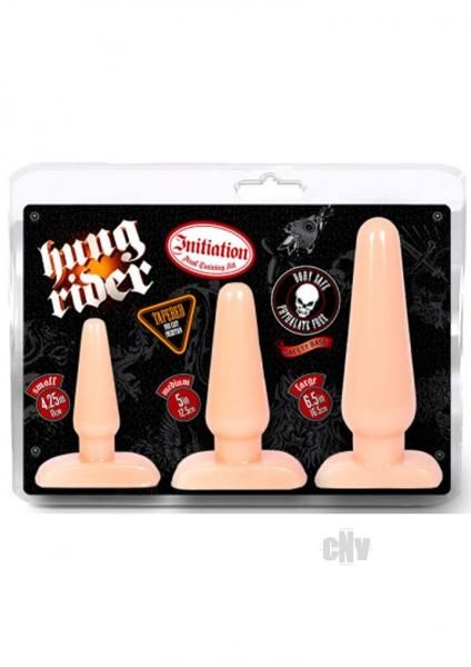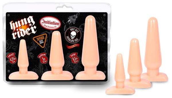 Ready to take a ride into extreme anal exploration? The Hung Rider Initiation: Anal Training Kit will help you safely work your way up to major length and girth! Start small and soon you will be ready to go large. Hung Rider plugs are made of solid latex free and fragrance free PVC. Each plug is tapered for comfortable insertion and is equipped with a neck to hold it in place and a firm base for anal safety. You can go from beginner to badass with one purchase. Lube them up and get ready for a wild ride!.