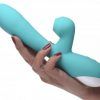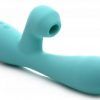 Inmi Shegasm 5 Star 7X Suction Come Hither Rabbit Vibrator Teal from XR Brands. Get ready for 5 Star Come Hither treatment! This intense rabbit vibe provides powerful pleasure directed at your G-Spot and clitoris simultaneously. Perfect for players who love forceful, versatile toys to fulfill their cravings. The curved tip is designed to grind back and forth on your G-Spot, while the indulgent clit stimulator sucks and pulses on your fun button! The mighty dual motors send deep hitting vibrations throughout your body. Choose from 3 speeds and 4 patterns of combination suction and vibration pleasure, as well as 3 come hither speeds for your G-Spot. Flip through all functions with the onboard control buttons, and activate the turbo mode as you climax for a toe curling peak of pleasure! This curved, sultry shaft is flexible and plush for a comfortable insertion and fulfilling texture for you to squeeze on. Made with premium, phthalate free silicone for a body safe and luxurious experience! Designed with IPX7 waterproofing so you can insert and play without worry, as well as clean this 5 Star rabbit with ease. Rechargeable via included USB charging cable. 5 years warranty included!