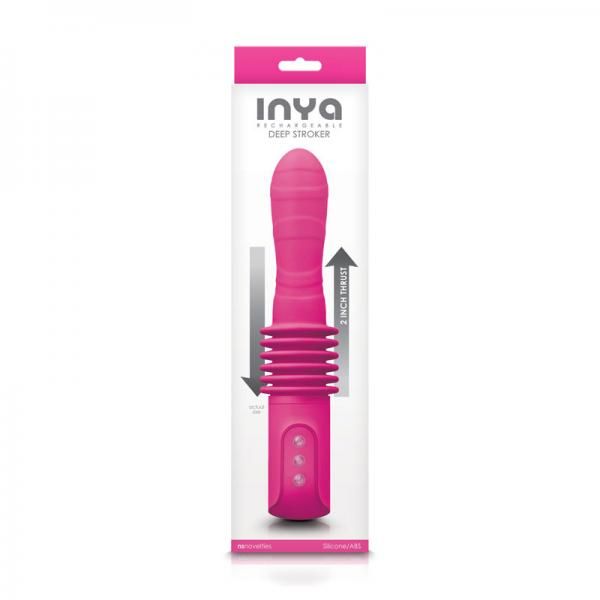 The Deep Stroker Thrusting Vibrator from NS Novelties. The Deep Stroker by Inya features a longer range of motion for profound thrusting and intense vibration for explosive orgasmic pleasure. This powerful and rechargeable vibe is made of body safe silicone and is suitable for use with all lubricants. In N out, Up N Down – the Deep Stroker by Inya. Made using body safe latex free, phthalate free materials Silicone, ABS Plastic. Size 11.5 inches by 2 inches. Thrusting range about 2 inches.