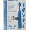 iVibe Select iQuiver 7 Piece Set Periwinle from Doc Johnson Novelties. The iVibe Select iQuiver is an innovative petite vibrator with 6 interchangeable heads, each of which provide a unique feel. The vibrator flaunts 10 vibrating patterns, which allow for a total of 60 individual sensations. The iQuiver small size and various head shapes make it multi-functional, able to stimulate many erogenous zones. USB Rechargeable. Cable included. Waterproof vibrations. Includes bag for discreet storage and travel.