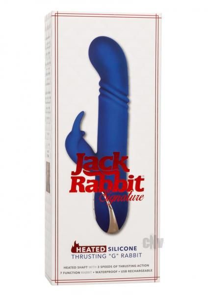 After over 30 years of pleasure, the Jack Rabbit® has crafted their most luxurious vibrator yet. The Heated Silicone Thrusting G Rabbit is a premium silicone vibe with 7 functions of vibration, 3 tip thrusting speeds and unique heating element. The ravishing rabbit flicker to the rhythm of 7 thrilling functions vibration to tease, please and tantalize.Indulge in deep, rumbling stimulation with a sensually curved G tip and 3 functions of shaft thrust levels. This one-of-a-kind rabbit knows how to turn the heat up in the bedroom with a unique heating element that can reach up to 131° F (55° F) in just 4 minutes. Use the independently controlled heating element to get things hot and heavy at the touch of a button.Whether you`re taking a dip with a lover or indulging in a steamy solo session, look forward to up to 2.5 hours of waterproof vibration. Recharge pleasure and get back to playtime in only 2 hours with the provided USB cable. The flexible massager is made from a hygienically superior silicone. This body safe material is unscented and phthalate free to keep your most sensitive spots happy and healthy.