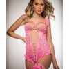 Start a love affair with this sexy and edgy jacquard lace garter skirt with architectural straps, perfect cutouts, and bling details. Matching wire cups enhance cleavage while being suspended by straps. Includes thong and stockings.
