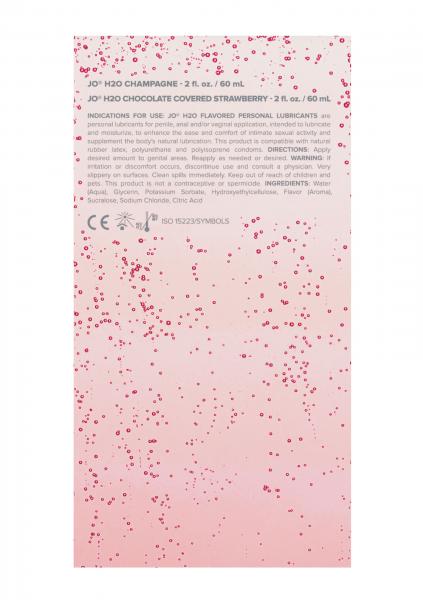 JO Sweet and Bubbly Pleasure Set Champagne Chocolate Covered Strawberry Flavored Personal Lubricant. 2 bottles. 2 fluid ounces. Water Based Flavored Lubricant. JO Sweet and Bubbly is not just for Valentine’s Day. This romantic gift set includes one 2 ounces bottle each of our all new Chocolate Covered Strawberry and Champagne flavored lubricants. Like all JO water based flavors, these new formulas feel as good as they taste. JO Sweet and Bubbly is your invitation to an exclusive party for two. You will get two 2 ounces bottles to pop: one each of our all new Chocolate Covered Strawberry and Champagne flavored lubricants. These amazing flavors featuring our water-based formula feel as good as they taste. Whether you try them together or one at a time, you’re sure to have a fancy night to remember. Tagline JO, Party of Two. Ingredients: Water, Glycerin, Potassium Sorbate, Hydroxyethlcellulose, Flavor, Aroma, Sucralose, Sodium Chloride, Citric Acid. Categories: Lubricants, Water Based Lubricants, Flavored, Health and Beauty Aids, Valentine’s Day Gifts. 2022.