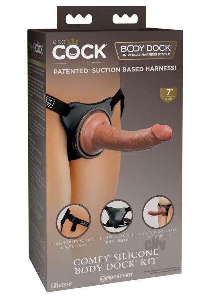 NO RINGS, NO SNAPS, NO HASSLE! The patented* Comfy Silicone Body Dock® Kit includes everything you need to take strap-on play to a whole new level! Every King Cock® is responsibly crafted with compliant materials and carefully checked to match our top quality guidelines. You can enjoy every King Cock® masterpiece with full confidence. CHANGING YOUR FAVORITE STRAP-ON ACCESSORY HAS NEVER BEEN EASIER! Includes a 7 Silicone King Cock Elite Dildo Heavy Duty Nylon Straps andamp; Strong Plastic Adjusters Padded Form-Fitted Body Plate The wide, padded, form-fitting body plate help to distribute pressure evenly across the pelvic region. Concave Suction Dock The tilted suction dock creates an incredibly strong bond with most suction cup accessories. Patented* Push andamp; Play Design Works With Most Suction Cups Simply push the suction cup of your favorite dildo or vibrator against the concave suction dock until ALL of the air between them is released! The suction creates a super-strong bond with no need for rings or snaps! Angled Suction Plate Keeps Your Dildo Erect The Body Dock® has been designed with an angled suction dock to help counteract sagging caused by traditional harnesses, keeping everything looking as natural and true to life as possible. Designed for Superior Comfort The wide, form-fitted, padded body plate distributes pressure evenly across the pelvic region, reducing pin-point pressure that can be caused by traditional harnesses. In addition, the heavy duty nylon straps and plastic adjusters make the harness fully adjustable to fit most sizes. Soft Touch Padding Adds an Additional Level of Comfort Easily Adjusts to fit Waist sizes up to 54 (137 cm) 1 Year Limited Warranty