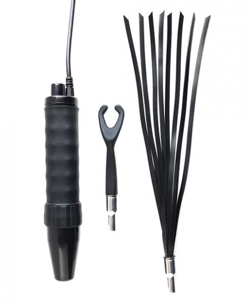 The Electro-Whip is ten heavy falls of conductive silicone. Solid technology allows you to swing this electrifying whip similar to a normal flogger to add a little bite to your licks. The electric shock combined with the impact of the flogger is the ultimate double down.