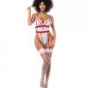 A versatile babydoll that transforms into a two-piece set. Detachable mesh skirt, lace top with criss cross design and matching thong. Adjustable straps, Flowy.