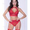 Lace, Netting Long Line Bra, Garter Belt & Open Crotch Thong Red XL