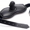 Fill the mouth of your precious plaything with cock to keep them quiet! This unique leather gag adjusts around their head to tighten down and restrict speech! The comfortable padding along the interior will feel luscious against your slaves face. The silicone penis gag will muffle every gasp, whimper, and moan. This high-quality leather accessory will elevate your BDSM and bondage scenes with its alluring aesthetic and effectiveness. Measurements: Strap adjusts from 18 to 24.5 inches in length. Gag measures 2.75 inches long and 1.75 inches in diameter. Material: Leather, silicone, metal. Color: Black.