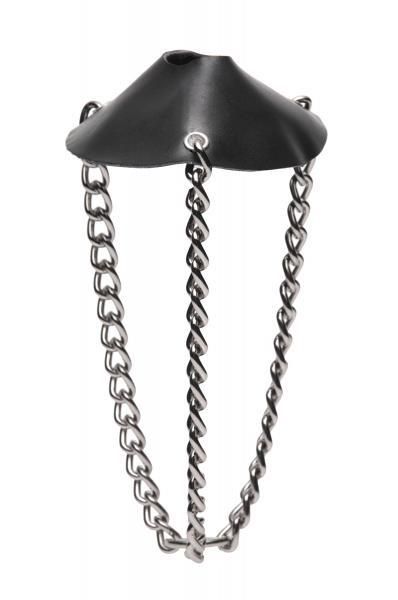 Made from quality leather, this parachute wraps around at the base of your balls and secures using 2 snaps. Once put on, there are three chains that hang from the parachute and connect to a metal ring at the bottom where you can place a weight and start stretching those balls out! This allows you to for the weight to be evenly distributed so there will not be more weight on any one side.