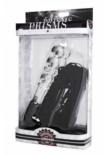 This handcrafted impact toy has a sparkling glass handle and multiple soft suede falls, for incredible sensation inside and out. The handle doubles as a sensual dildo, textured for maximum stimulation. The temperature sensitive and durable Borosilicate glass can be heated up or cooled down for even more sensation play. Treat yourself to erotic bliss with Lingam! Measurements 26 inches in total length, 6.25 insertable, 1.25 inches in diameter. Material Glass, leather. Color Black.