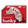Chastity is Hüj! Self-imposed or a part of couple`s play, LOCKDOWN is hünkyjunk`s meaty-thick and weighty chastity toy. We made this one thicker–the rubbery-soft silicone blend is stretchy but restrictive…an erection is difficult in LOCKDOWN. There`s more room inside: LOCKDOWN stretches to fit any size guy, even the Hüj ones and the sling style base keeps it on–the ball-ring is more substantial so it stays in place. More head room drives guys in chastity nuts–they get more sensation, more friction-frustration, but can`t do anything about it. The curve in the shaft makes erections less comfortable, but keeps chastity possible under clothing, 24/7, with more bulge but still discrete. LOCKDOWN does give a meaty bulge even if it locks down your cravings and locks out your ability to JO…one of the few toys hünkyjunk designed to deny your pleasure. Our plus+silicone TPR/silicone blend: silicone for a smooth and warm feel, TPR for amazing stretch and strength. Phthalate free. Dimensions: Width: 1.5 to 2 in. Height: 4.75 in. Depth: 1.5 in. Main Hole Circumference: 4 in. Shaft Hole Circumference: 3 in. Ball Hole Circumference: 3 in.