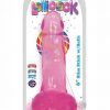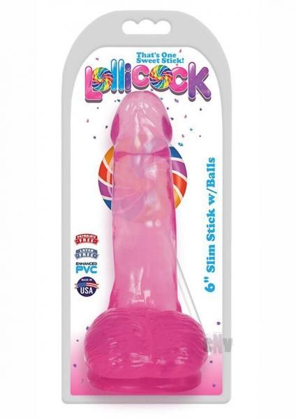 Lollicock 6 inches Slim Stick Cherry Ice Pink Dildo with Balls. Super slim and sure to please. Life like, hand crafted, super slim and see through. Ultra premium Enhanced PVC. Harness compatible suction cup grips any flat surface. Firm and pliable for ultimate comfort and pleasure. Low maintenance. Easy to clean. Available in three translucent colors: Cherry Ice Pink, Berry Ice Blue, Grape Ice Purple.