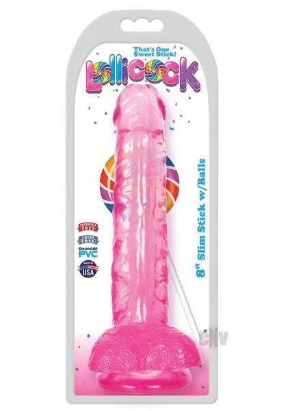 Lollicock 8 inches Slim Stick Cherry Ice Pink Dildo with Balls. Super slim and sure to please. Life like, hand crafted, super slim and see through. Ultra premium Enhanced PVC. Harness compatible suction cup grips any flat surface. Firm and pliable for ultimate comfort and pleasure. Low maintenance. Easy to clean. Available in three translucent colors: Cherry Ice Pink, Berry Ice Blue, Grape Ice Purple.