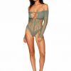 Long Sleeve Teddy Sage Green One Size from Dreamgirl Lingerie. Experience the allure of the Seamless Long Sleeve Teddy, blending intricate opaque and fishnet detailing alongside a captivating novelty pattern bodice, designed to mesmerize and flatter. Enhancing its elegance, this Teddy boasts a removable gold halter chain, offering versatility in styling options and adding a touch of sophisticated glamour to your look. The seamless construction ensures a sleek and comfortable fit, ideal for all day wear or intimate moments. The combination of long sleeves and novelty bodice pattern offers a unique and stylish aesthetic, perfect for making a bold statement in your lingerie collection. One size fits most. Ladies sizes. Sizes 2 to 14. Cups B/C. Bust 32 inches to 38 inches. Waist 24 inches to 32 inches. Hips 34 inches to 40 inches. Weights 90 pounds to 160 pounds.