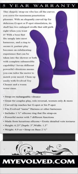 Love Harnessed Purple Rechargeable Vibrating Dildo from Evolved Novelties. Love is back. 5 year warranty. Body safe. Waterproof. Strap on rechargeable vibrator. Great for couples play, role reversible, women only and more. Curved tip reaches her g-spot or his p-spot. Fits Evolved Novelties harness or other harnesses. Not included, sold separately. Includes 1.75 inches silicone O-ring. Powerful motor with 7 different functions. Made from luxurious silicone. Erotic detailed vein texture. Height 6.25 inches, depth 3 inches, width 1.5 inches. Weight 4.9 ounces. Color Purple.