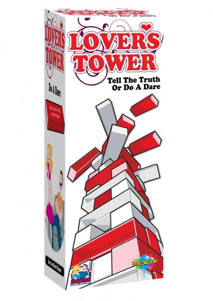 The Lover`s Tower is a naughty game of truth or dare. To start, remove a block and either answer a titillating truth or perform a dastardly dare, before stacking the block on top of the Lover`s Tower. Learn your friend`s dirty little secrets, squeal like a sex-crazed barn animal and remember…Don`t make the tower fall!