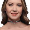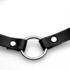 This elegant collar is a great accessory for any outfit. Subtle and refined, it can be worn during the day during work or at night with a lover. The silver O-ring is a subtle and beautiful accent on this black, leather collar. With adjustable clasps, this collar can be adjusted to the perfect fit. The PU leather collar has a smooth, real leather look on the outside and a soft inner lining that faces the skin. The metal O-ring is placed at the center of the collar and is nickel-free. Adjustable clasp is made of a lobster clasp and chain for the perfect fit. Measurements : Overall length: 16.25â€, Adjusts from 12.5†to 15.5†circumference, O-ring inner diameter 0.75†Materials : PU Leather, metal Color : Black, silver metal