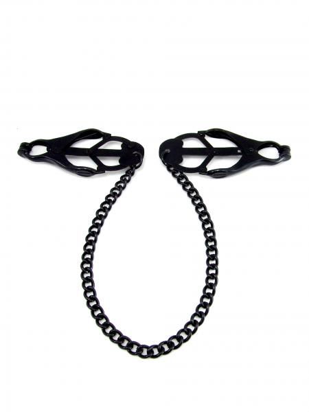 M2M Nipple Clamps with Chain Black. Nipple Clamps Jaw Ends with Black Chain. Titillation with a touch of glamor! Jaws clamps are also referred to as clover clamps, butterfly clamps or endurance clamps. This clamp is of Japanese design and can provide increasing tension if pulled, can be done by the chain. The clamp itself is flat and is 3.5 inches long by 1.50 inches wide. The clamps are made from aluminum and are connected by a 12.5 inches steel chain. The clamp is applied to the nipple and the spring tension holds the clamp in place. The clamp usually provides a very high pain level, and is usually only used by more advanced users. To increase tension on the nipples, small weights can be attached to the ends of the clamp. As increased pulling tension is applied to the clamp, it will cause the jaws of the clamp to close tighter.