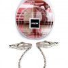 M2M Nipple Clamps with Chain Chrome. Nipple Clamps Jaw Ends with Black Chain. Titillation with a touch of glamor! Jaws clamps are also referred to as clover clamps, butterfly clamps or endurance clamps. This clamp is of Japanese design and can provide increasing tension if pulled, can be done by the chain. The clamp itself is flat and is 3.5 inches long by 1.50 inches wide. The clamps are made from aluminum and are connected by a 12.5 inches steel chain. The clamp is applied to the nipple and the spring tension holds the clamp in place. The clamp usually provides a very high pain level, and is usually only used by more advanced users. To increase tension on the nipples, small weights can be attached to the ends of the clamp. As increased pulling tension is applied to the clamp, it will cause the jaws of the clamp to close tighter.