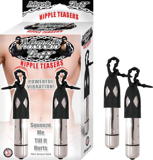Mack Tuff Nipple Teasers Silver Black from Nasstoys of New York. Easy push button vibration. Pull straps to snug or loosen on nipples. Squeeze me till it hurts. Waterproof vibrations. Phthalates free, RoHS compliant materials Black is silicone, Chrome is ABS plastic.