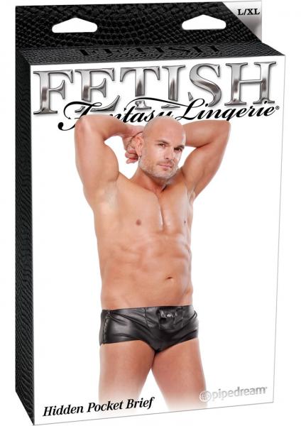 Fetish Fantasy Lingerie Series Male Hidden Pocket Brief features: Vinyl Front Brief with Lycra Back Front Snap Pocket. Men sizes large to extra large. Waist 36 inches to 40 inches. Materials: PVC, Polyester, Spandex. Country of origin: China.