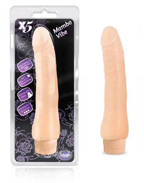 Blush Novelties X5 Series Mambo Vibe is a nine inches, multiple speed vibrator with a realistic penis shape that is slightly curved for rhythmic stimulation. Hand crafted from premium grade phthalate free Thermoplastic TPR, Mambo Vibe is ultra soft and flexible and is waterproof for dirty dancing in the shower. Mambo Vibe Moves with 2 AA batteries (not included) and is easy to clean with soap and water or a toy cleaner. Cha-cha-cha todo la noche con el Mambo Vibe. Features: slightly curved for maximum stimulation. Slim fit great for beginners. Stronger vibrations. Waterproof for play both in the water and out. Made from premium grade phthalate free materials. Soft and flexible. Multiple speed powerful vibrations. Battery operated sex toy. 5X Mambo Vibe from Blush Novelties.