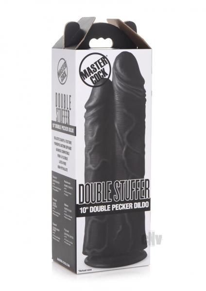 Prepare to be double dipped with Master Cock`s Double Stuffer. Can you handle 10 full inches of cock to cock penetration? Heavy vein detail wraps these two throbbing cocks up their entire shafts. Strong suction cup base allow you to suction to your shower or any flat surface for hands free play. Harness compatible for use with a partner. Fill your ravenous hole with these two meaty cocks! Made from latex free, Non Phthalate PVC. Measurements: Overall length (with suction cup): 10.6 Dildo length (without suction cup): 9.8 Narrowest able diameter: 3.1 Widest able diameter: 3.5