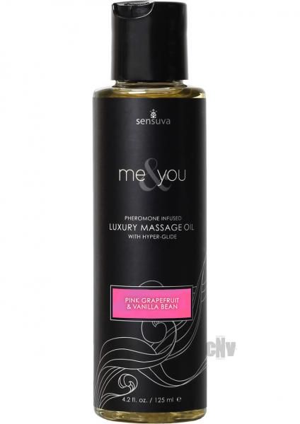 The Me & You Pheromone Infused Luxury Massage Oil with Hyper Glide Massage Oil Pink Grapefruit and Vanilla Bean 4.2 ounces. This new line of luxury massage oils and lotions are infused with gender friendly pheromones to make both partners feel attractive and turned on. Sensuva has added a special hyper-glide which has a touch of silicone so that your massage oil or lotion can stay on the surface of your skin longer. A little bit goes a long way, and you will end up using less product and be able to enjoy a longer lasting massage. The entire line ranges from simple clean scents, to provocative blends including exotic floras, sweet and dark fruits, sugars, and aphrodisiacs. They are all made with natural ingredients and a blend of moisture rich oils, essential oils and natural preservatives.