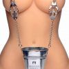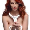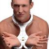This heavy duty piece of bondage equipment has a unique design, both in appearance and function. Similar to the restraint used in the film Logan, this restraint keeps your lovers hands immobilized in front of them. A single pin closes this contraption on your playthings neck and wrists. Secure the included lock through the pin to ensure that your partner is fully confined until you have had your way with them. Made of metal, this beautiful and intimidating piece will remind your captive of their place. This device works best on medium to large hands, as smaller hands may be able to escape the restraints.