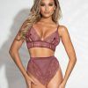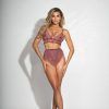 Midnight Kiss 2 Piece Bralette Set Mauve O/S from Seven Til Midnight. This romantic plus size lace bra set features sheer triangle cups with peek-a-boos, satin bow accents, adjustable shoulder straps with gold hardware, hook back closures, matching high waisted panty with sheer triangular panel and a satin ribbon tie back closure.